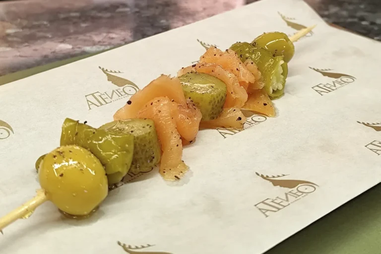 Gilda XXL con salmón ahumado, piparra dulce sarasa y pepinillo agridulce.