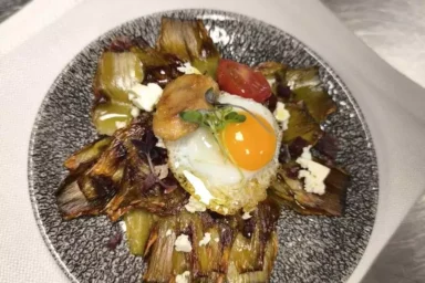 Alcachofa confitada a baja temperatura, jamón ibérico, queso feta, cebolla caramelizada, foie, huevo de codorniz al aroma de trufa negra