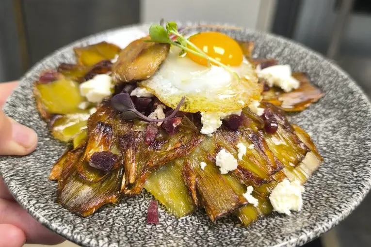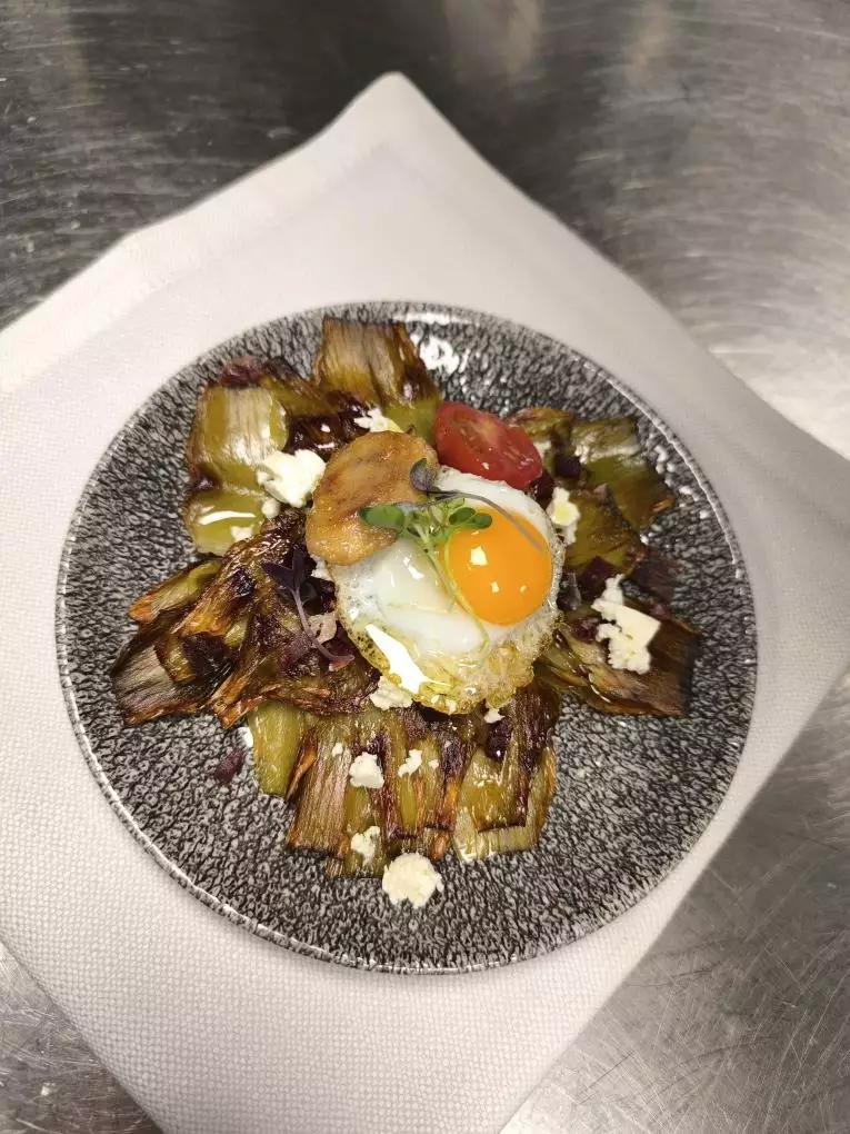 Alcachofa confitada a baja temperatura, jamón ibérico, queso feta, cebolla caramelizada, foie, huevo de codorniz al aroma de trufa negra