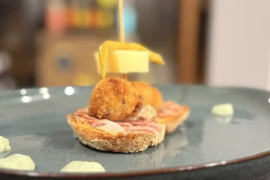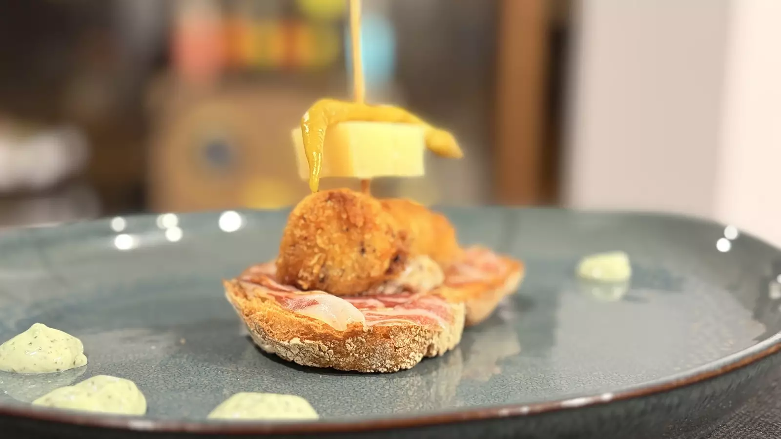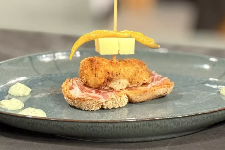 Pan casero de masa madre, coppa ibérica de bellota El Regalao, croqueta de cecina de buey El Capricho, Idiazabal curado, guindilla piparra y salsa de jalapeño asado