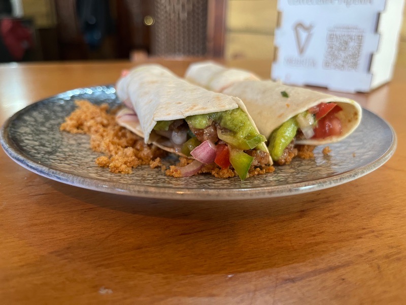 Es un aperitivo que combina tradición, mezcla de cultura y morderno, la tapa nace sobre la base de nuestra tapa más reconocida como los chicharrones, dándole un toque mexicano al acompañarlo de pico de gallo y guacamole sobre una tortita de trigo la que enrollamos para que sea más fácil de comer.