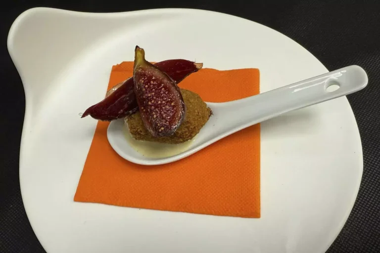 Croqueta de confit de pato, sobre crema de foie y su jamón curado