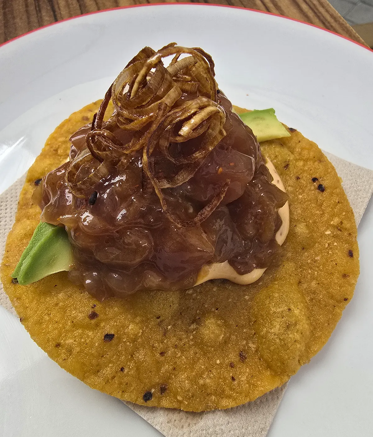 Es un guiño a México con el pescado de mayor calidad de nuestras aguas. Unas tostada de maiz frito, una base de emulsión de Chipotle, aguacate, atún aleta amarilla pescado en aguas canarias marinado con ponzu y un topping de puerro frito y sishimi togarashi