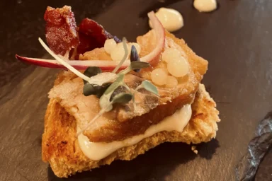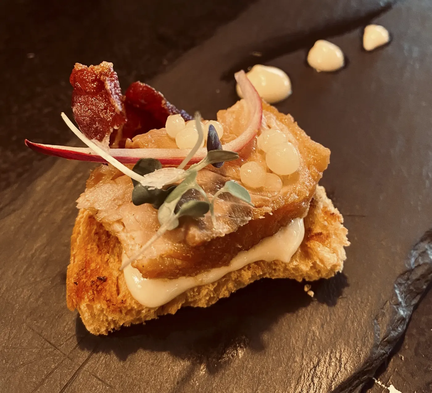Tosta de pan de calabaza y pipas , trucha escabechada , crujiente de cecina , perlas de cítricos , micromezclum y una mahonesa de escabeche