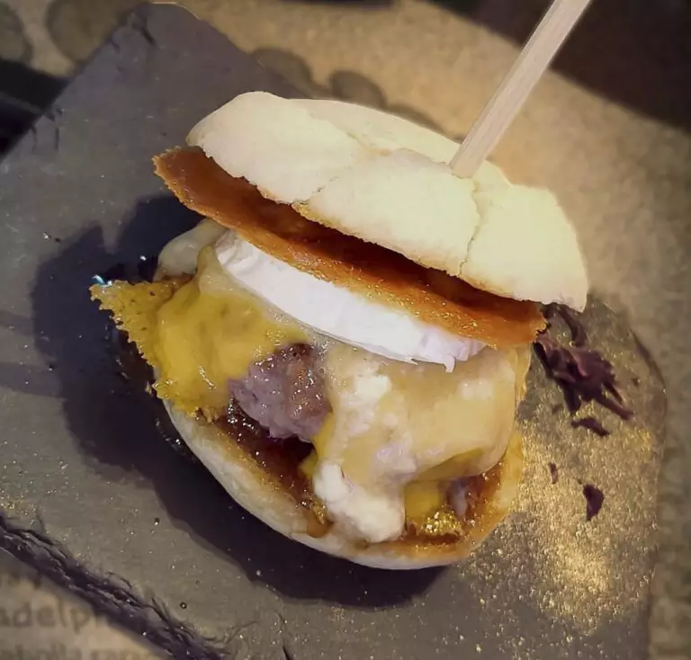 Comenzamos con la base de un pan tipo mollete añadiéndole una mermelada de tierra de bacon crujiente, continuamos con una carne de ternera avileña 100%, con una mezcla de queso edam,fundiéndose por encima queso cheedar y coronando con un medallón crujiente de queso de cabra.