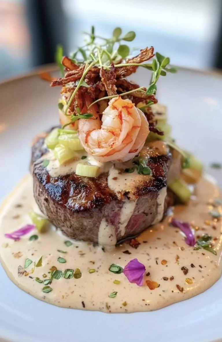 Medallon de solomillo a la brasa con pimientos y cebollino. Gambas con cebolleta y cebolla crujiente en dos texturas.