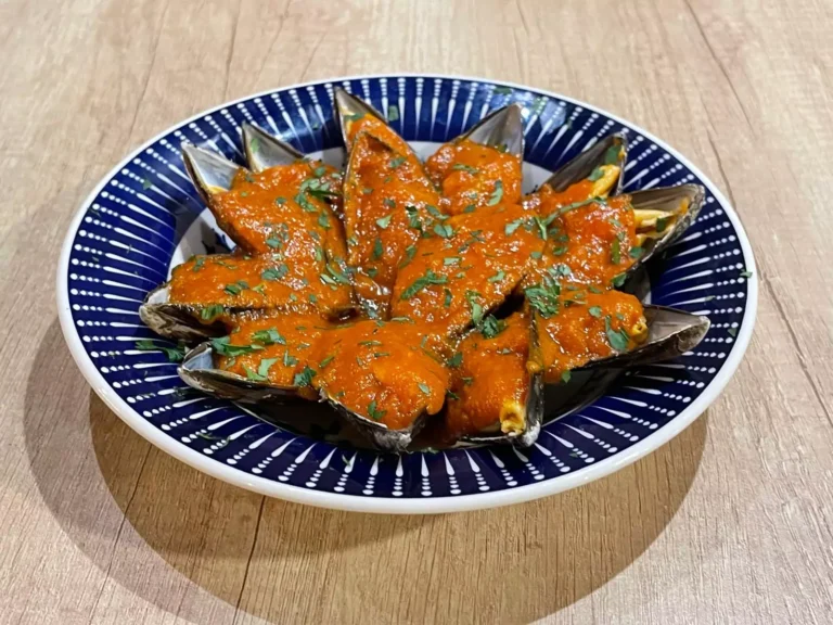 Mejillones Gallegos en salsa de Vermú, una salsa adictiva de tomate estilo marinera reducida durante dos horas a fuego lento en vermú blanco, que le aporta aroma, sabor y complejidad, añadiéndole notas dulces, amargas y herbales a la salsa.